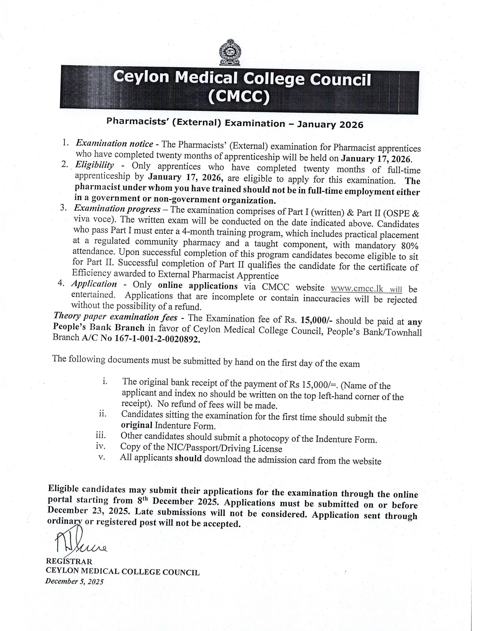 External Pharmacist Examination, January – 2026 December 9, 2025December 9, 2025 admin Click here to Registrar